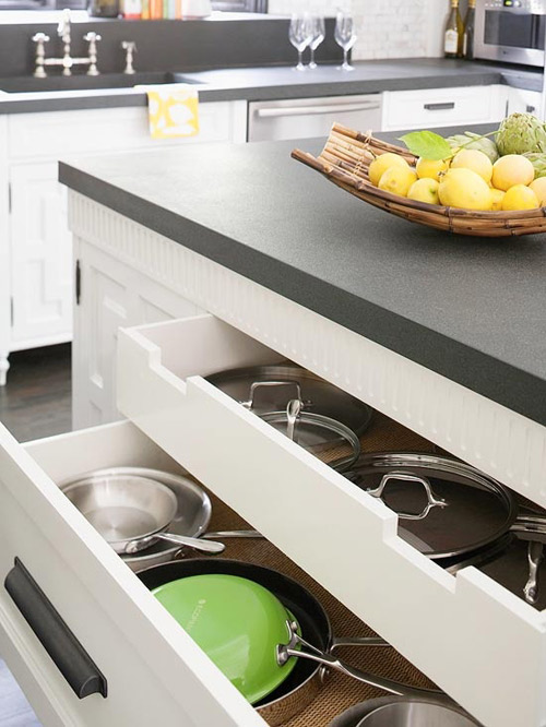 Bây giờ, hãy dành thời gian để nói về những gì diễn ra bên trong những ngăn kéo tủ và đằng sau những cánh tủ bếp. Tôi say mê với ý tưởng lưu trữ các công cụ cắt gọt thành nhóm bên trong các ngăn kéo. Cách này không chỉ giải phóng không gian bề mặt bếp mà còn giảm nguy cơ gây tổn thương cho con người.