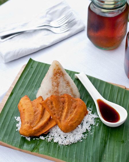Cẩn thận bỏ xôi ra đĩa và sắp xếp vài miếng chuối chiên bên cạnh. Rắc dừa nạo và rưới chút nước xốt đường cọ vào.